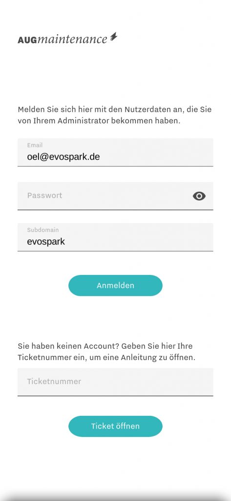 Die Zugangsdaten bekommen Sie von dem Mitarbeiter Ihres Unternehmens, der als AUGmaintenance-Administrator registriert ist.
