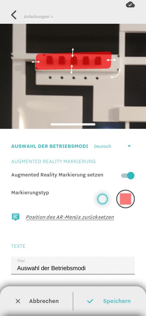 Um für einen Anleitungsschritt eine Augmented Reality Markierung zu setzen, gehen Sie in den Editiermodus des jeweiligen Schritts und aktivieren die Option “Augmented Reality Markierung setzen”. Dadurch öffnet sich die Kameraansicht und das Menü verschiebt sich in den unteren Bildschirmbereich: