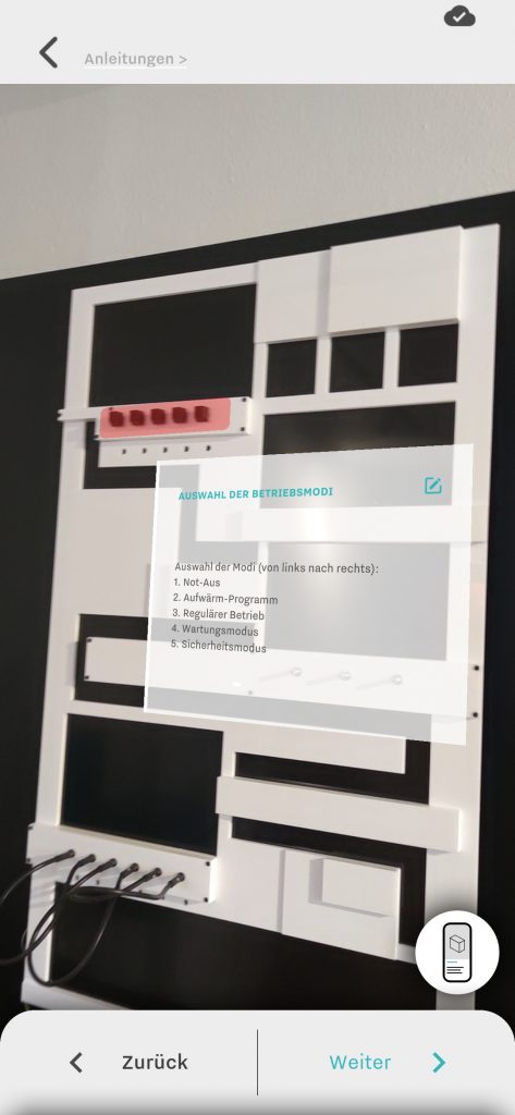 Das AR-Menü ist eine alternative Darstellung, bei der nicht nur die AR-Markierung, sondern der komplette Anleitungsschritt inklusive Texten, Bildern, etc. in einer AR-Ansicht dargestellt wird. Der Nutzer kann die beiden Modi über den Button am rechten Bildschirmrand umschalten.