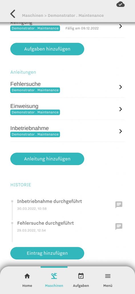 Am Ende der Maschinenansicht wird die Historie angezeigt, d.h. die protokollierten Arbeiten, die an dieser Maschine durchgeführt worden sind.